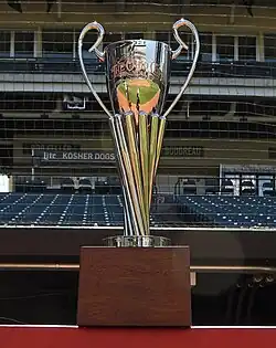 The Ohio Cup was reintroduced in 2008 with a new trophy. The trophy was 3 feet high, with a 12-inch stainless cup in the middle. It is awarded to the team that wins the season series in a given year. When the teams split the season series, the team that currently holds the trophy retains it. Through the 2024 season, the Indians/Guardians have won the trophy seven times, the Reds four times, with six ties.[12]