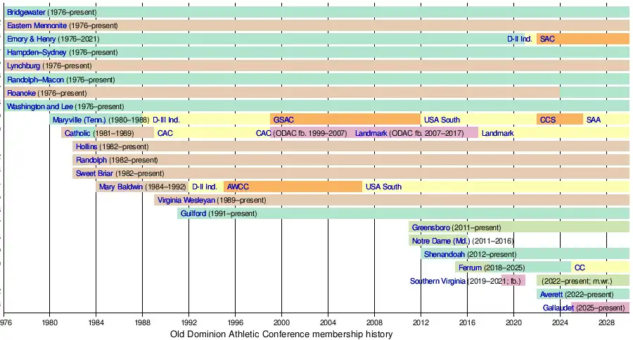 The conference was founded in May 1975 as the Virginia College Conference.[1] On January 1, 1976, the name was changed to the Old Dominion Athletic Conference. The 1976–77 season was the first in which championships were offered. In 1980, Maryville College joined and became the first member outside of Virginia. In 1981, Catholic University joined the conference after leaving Division I's ECAC South Conference. In 1982–83, women's sports were added, and Hollins College (now university), Randolph–Macon Woman's College (now Randolph College), and Sweet Briar College all joined. Mary Baldwin College (now university) joined in 1984. In 1988, Maryville left and was replaced by Virginia Wesleyan College (now university). In 1989 Catholic left the conference to become a charter member of the Capital Athletic Conference, returning in 1999 as a football-only member.[2] They were replaced by Guilford College two years later. The next school to leave the conference was Mary Baldwin, which left in 1992.