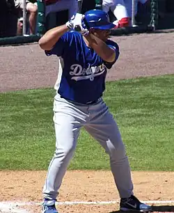 A question mark because of his injury history, Sáenz was not retained by the A's and wound up attending spring training with the Los Angeles Dodgers as a non-roster invitee, earning a spot on their roster as the primary right-handed pinch hitter. He was part of Major League history when, on September 8, 2004, he hit a pinch-hit grand slam homer, marking the first time in MLB history that a team had a pinch-hit grand slam in back-to-back games, as Robin Ventura hit one on September 7.[1] His best year came in 2005, when he set a career high in almost every offensive category including home runs (15) and RBI (63). He also had a solid 2006 season when he hit for a batting average of .296 with 11 home runs and 48 RBI.