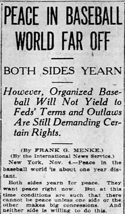 Headline and lead of a November 1914 article written by Frank G. Menke discussing tension between organized baseball and the Federal League ("Feds").