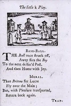 A 1744 book in England by children's publisher John Newbery called A Little Pretty Pocket-Book includes a woodcut of a game similar to three-base stoolball or rounders and a rhyme entitled "Base-Ball". This is the first known instance of the word baseball in print.[18] John Thorn, Major League Baseball's official historian, speculates that the game depicted may have involved hitting the ball with a bare hand, as in punchball, and that hitting with a bat may not have become established until later in the century.[19][20]