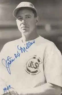 Miller served in the United States Army in late 1944 and early 1945. After spending most of the 1947 season with Double-A San Antonio, Miller had his contract purchased by the Chicago Cubs at the beginning of September. The Cubs thought Miller could improve their finish in the standings.[1] Miller made four starts for the Cubs that September, posting a 1–2 record and a 10.13 ERA.[2] In his final outing of the year, on September 18, he gave up seven runs in 4+2⁄3 innings, taking the loss in a 9–5 defeat by the New York Giants.[3] In sixth place with a 57–71 record before acquiring Miller, the Cubs finished the season in sixth place, with 69 wins and 85 losses, plus one tie.[4]
