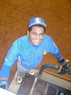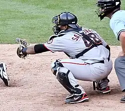 Sandoval made the Giants' Opening Day roster out of spring training in 2009 as the Giants' starting third baseman and backup catcher.[10][13] He served as a personal catcher for Zito at the beginning of the year.[14] On May 12, Sandoval hit his first walk-off home run against Joe Beimel to beat the Washington Nationals 9–7.[15] Following an elbow injury to Sandoval in May, the Giants called up Eli Whiteside to serve as the backup catcher on May 24; since then, Sandoval has not been used at all as a catcher.[3][16] After 73 games played, San Francisco Chronicle columnist Scott Ostler wrote that Sandoval had made the most impressive transition from the Giants farm system since 1986 when Will Clark and Robby Thompson were rookies.[17]