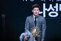 In 2014, he batted .298 and scored 87 runs in 118 games, and ranked second in the league with 50 steals. He claimed the KBO League Rookie of the Year Award.[2]