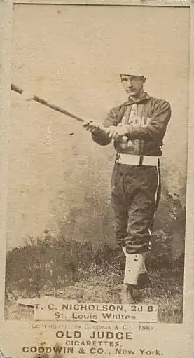 The 1888 Detroit team finished in fifth place with a 68-63 record.[4] With high salaries owed to the team's star players, and gate receipts declining markedly, the team folded in October 1888 with the players being sold to other teams. Nicholson was acquired by the Cleveland Spiders, but the Spiders sold Nicholson to the Toledo Mud Hens of the International League in May 1889 for $500.[1] Nicholson appeared in 87 games for the Mud Hens in 1889 and moved with the team when they joined the American Association and became the Toledo Maumees in 1890. Nicholson appeared in 134 games, all at second base, for the Maumees in 1890, his lengthiest stint in the majors. He compiled a .268 batting average with 11 triples, four home runs, 72 RBIs and 46 stolen bases.[1]