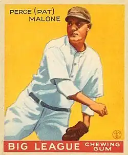 Perce Leigh "Pat" Malone (September 25, 1902 – May 13, 1943) was an American pitcher in Major League Baseball who played from for the Chicago Cubs (1928–1934) and New York Yankees (1935–1937). Listed at 6 feet 0 inches (1.83 m) and 200 pounds (91 kg), Malone batted left-handed and threw right-handed. He played for four pennant winners and two World Series champions.