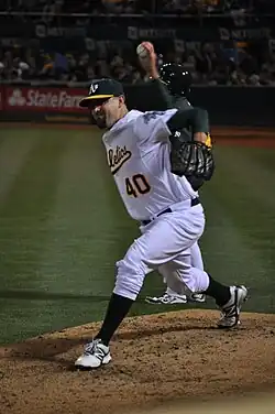 On November 30, 2012, Neshek avoided arbitration by agreeing to a one-year, $975,000 deal with the A's.[37] He started the season well, posted a 2.34 ERA in his first 38 appearances into August, with 30 of them being scoreless. However, he gave up three runs apiece in two different appearances in August, raising his ERA to 3.58.[38] Neshek attributed his early success to throwing almost exclusively sliders to right-handed hitters.[39] Of all his pitches, he threw the slider 73 percent of the time in 2013.[36]