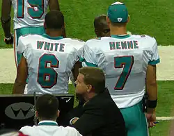 White was drafted by the Miami Dolphins with the 44th overall pick of the 2009 NFL draft, through a pick acquired from the Washington Redskins in a trade that sent Jason Taylor to Washington.[35] After being drafted, Dolphins' general manager Jeff Ireland stated that White would be in competition for the starting quarterback job with Chad Pennington and Chad Henne, while also being used in the Wildcat formation (effectively making it a spread), and as a receiver. On August 1, 2009, the Dolphins agreed to terms with White on a four-year deal worth around $4.5 million. The deal included $2.4 million in guaranteed money.