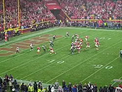 In the Divisional Round against the Houston Texans, the Chiefs faced a 24–0 deficit early in the second quarter. The Chiefs then went on a 51–7 run, including 41 unanswered points, to win 51–31. Mahomes threw for 321 yards and five touchdowns and rushed for 53 yards.[117] In their second AFC Championship, facing the Titans, Mahomes threw for three touchdowns and rushed for a 27-yard touchdown, the second longest run of his career and longest in the playoffs. He sparked a comeback from 17–7 in the second quarter to a 35–24 victory.[118] The Chiefs made their first Super Bowl appearance since Super Bowl IV in 1970.[118] In Super Bowl LIV, the Chiefs trailed 20–10 against the San Francisco 49ers in the fourth quarter with 8:53 remaining. It was their third straight game facing a 10+ point deficit. With just over 7 minutes to play, a successful 49ers challenge of a completed catch left the Chiefs facing 3rd and 15 on their own 35-yard-line. Mahomes asked his coaching staff to call the play Jet Chip Wasp, and successfully completed a deep pass to Tyreek Hill for 44 yards. This shifted momentum towards the Chiefs, who in the remaining minutes of the game went on a 21–0 run, securing their first Super Bowl victory in 50 years.[119] Mahomes threw for 286 yards and two touchdowns, with two interceptions, and rushed for another 29 yards and touchdown run and was named Super Bowl MVP.[120] He was the youngest quarterback and third-youngest player in NFL history to earn the award.[121][122] Mahomes also became the third African American quarterback to win a Super Bowl, joining Doug Williams and Russell Wilson.[123] He was ranked fourth by his fellow players on the NFL Top 100 Players of 2020.[124]