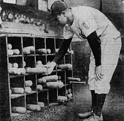 In October 1925, the Pittsburgh Pirates of the National League purchased Waner and teammate Hal Rhyne from the Seals for $100,000.[5][1][12] On April 17, 1926, against the Cincinnati Reds, he collected his first major league hit. On August 26, Waner collected six hits in six at-bats during a game against the Giants,[13] and he accomplished this feat using six different bats from six different players.[14] He ended his first season with a .336 batting average and led the NL in triples with 22. He also finished 12th in MVP voting as the Pirates finished in third place, 4.5 games behind the St. Louis Cardinals.[15] By Waner's second season with the Pirates he and his younger brother Lloyd had become stars; combined, they accumulated 460 hits in the 1927 season.[16] The 1927 season was a standout year for Paul. He played in a career-high 155 games (which led the league), and led the NL in hits (237), a team record,[17] triples (18), batting average (.380) and RBIs (131).[16] He set the major league record for consecutive games with an extra-base hit, with 14 (June 3–19, 1927);[18][19] Since then this feat has also been accomplished by Chipper Jones in 2006.[20] Aided by the contributions of the Waner brothers, Pittsburgh advanced to the 1927 World Series.[8] In the only postseason appearance of his career, Paul went 5-for-15 with 3 RBIs and a .333 batting average, but the Pirates were swept by the New York Yankees. In recognition for his performance during the 1927 season, the National League awarded him the NL Most Valuable Player Award.[16]