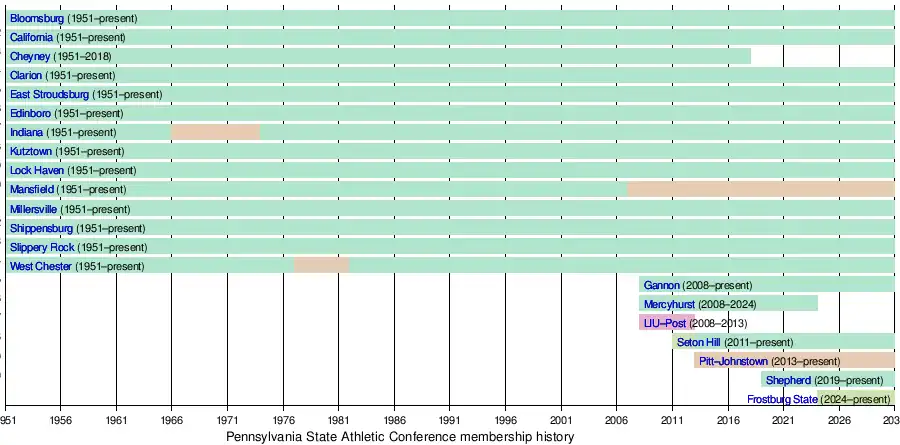 Membership remained unchanged until the conference announced on June 18, 2007, that it had invited three private universities—Gannon University and Mercyhurst College in Erie, Pennsylvania and C.W. Post of Brookville, New York—to join the conference.[3] Gannon and Mercyhurst left the Great Lakes Intercollegiate Athletic Conference to join the PSAC, effective July 1, 2008.[4] C.W. Post became an associate member for football and field hockey.[5]