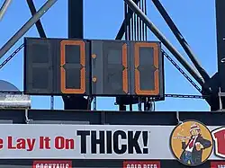 In addition to its primary use to time pitches, the clock indicates the time remaining in a television timeout for commercials (usually between each half of an inning), and also to time the warmup period on the mound for a relief pitcher coming out of the bullpen. There are multiple iterations and pitch clock units displayed throughout a major league stadium to allow its full visibility for players, coaches, umpires, press, and spectators throughout the venue, with each synchronized to keep in exact time, which is controlled by a field time coordinator who has direct communication with the umpires, who arbitrate and can overrule them in certain circumstances.[25] The system is also tied into by the production trucks of the game broadcasters, allowing them to display the pitch timer within the score bug, which as a backup can use a camera focused on the physical field timer if that system runs into technical issues.[26]