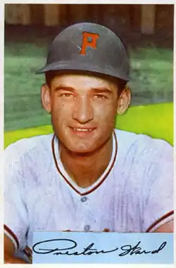 Preston Meyer Ward (July 24, 1927 – June 2, 2013) was an American professional baseball first baseman who appeared in 744 games over nine seasons in Major League Baseball (MLB) between 1948 and 1959 for the Brooklyn Dodgers, Chicago Cubs, Pittsburgh Pirates, Cleveland Indians and Kansas City Athletics.[1][2] Ward was born in Columbia, Missouri, and attended Missouri State University. He threw right-handed, batted left-handed, and was listed as 6 feet 4 inches (1.93 m) tall and 190 pounds (86 kg). His professional career began in the Brooklyn farm system in 1944 when he was 16 years old.