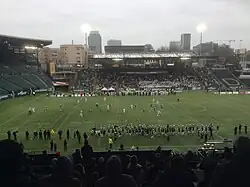 A few thousand seats were added for two games late in the 2011 season to bring the capacity to 20,323.[34] About 2,000 seats were opened up for the 2012 season, bringing capacity to 20,438. Following the 2012 season in which the Timbers' average attendance was 20,438, during the 2012–13 off-season the Timbers widened the pitch for the 2013 season, adding 2 yards (1.8 m) on each side to achieve a width of 74 yards (68 m).[35] The team widened the pitch by another yard in 2014, for a total pitch size of 110 by 75 yards (101 m × 69 m).[7]