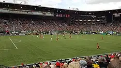 The 2001 renovation also removed the remaining seats along 18th Avenue and added in the first electronic video board in the park, modernizing the park for soccer and minor-league baseball.[25] The stadium was temporarily expanded for the 2003 FIFA Women's World Cup with bleachers along the east and south ends to bring soccer capacity from 19,556 to over 28,000. A grass surface was also installed for the tournament over the existing NeXturf artificial surface.[26][27]