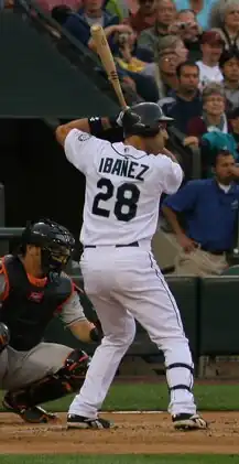 With Edgar Martínez retired, Ibañez moved to the DH spot before the 2005 season. In 2005, Ibañez hit .280 with 20 home runs and 89 RBIs. The Mariners acquired the switch hitting designated hitter Carl Everett from the Chicago White Sox during the 2005 offseason, forcing Ibañez to move back to where he played before, namely left field.[29] Ibañez enjoyed his most productive season with the Mariners in 2006, when he collected career-highs in home runs (33), RBIs (123), doubles (33) and triples (5), and hit .289 with 103 runs.[30] In 2007, the Mariners acquired José Vidro to assume the role of DH. Ibañez moved back out to left field and posted a .291 batting average with 21 home runs, 105 RBI, 80 runs and 35 doubles in 149 games.[31] Ibañez hit 12 home runs and 55 RBIs with a .321 batting average in the second half of the 2008 season. He finished the season with a .293 batting average, 23 home runs, 110 RBI, 85 runs and a career-high 43 doubles by playing 162 games that year.[32]