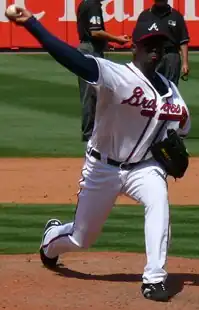 Soriano was traded to the Atlanta Braves from the Mariners on December 7, 2006, for left-handed pitcher Horacio Ramírez.[16] Soriano had a mixed bag of success and disappointment in his first season in Atlanta, primarily serving as the setup man to closer Bob Wickman. Soriano became the Braves closer after Wickman was designated for assignment in August.[17] Soriano earned his first save since May 10 on August 30, then earned three saves in September.[18] Soriano was suspended for four games on September 20 after hitting Dan Uggla with a pitch.[19] The suspension was reduced to two games after appeal.[20] He finished his first season as a Brave with a 3–3 record and 3.00 ERA. Soriano signed a two-year contract with the Braves worth $9 million on January 24, 2008.[21] However, elbow injuries limited him to only 14 innings in 2008.[22]
