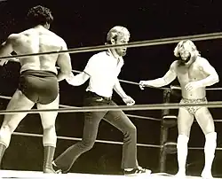 Savage (right) prepares to face off against Roberto Soto in a match held in Macon, Georgia, on August 23, 1977.[20]