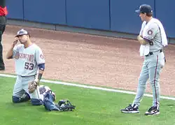![]() St. Claire (right) with Nationals catcher Wil Nieves in 2008. | |