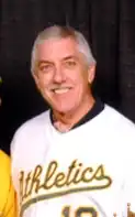 Fosse was acquired along with Jack Heidemann by the Oakland Athletics from the Indians for Dave Duncan and George Hendrick on March 24, 1973.[16] He played in 143 games that season, the most of his career, on a team with three 20-game-winning pitchers: Ken Holtzman, Vida Blue, and Catfish Hunter.[17] Fosse guided the Athletics pitching staff to the second best team earned run average as well the second most shutouts in the American League as, the Athletics won the AL Western Division pennant by six games over the Kansas City Royals.[18] The Athletics then defeated the Baltimore Orioles in the AL Championship Series.[19][20] Fosse made his mark in the series, throwing out five would-be base stealers.[2] The Athletics went on to win the World Series against the New York Mets.[21]