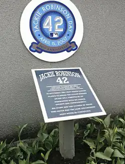 A plaque honoring Jackie Robinson in Monument Park at old Yankee Stadium. His 42 number was retired for all MLB teams in 1997