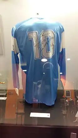Football shirt worn by Diego Maradona in Italian club Napoli. The number 10 he wore was retired by Napoli in 2000[30]