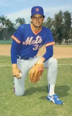Aguilera posted an identical record the next year in 1986 as the number five starter for the division-winning Mets. That season, he was involved in a fight with Houston police outside a disco which resulted in the arrest of not only himself, but also teammates Bob Ojeda, Tim Teufel, and Darling, later referred to as 'Cooters-gate'.[5] Misdemeanor charges against Aguilera were eventually dropped.[6] In the 1986 postseason, Aguilera pitched five scoreless innings in relief against the Houston Astros in the NLCS. Despite a 12.00 ERA in the World Series, he was the pitcher of record in the Mets' dramatic Game 6 comeback victory, getting the win despite giving up the two runs which surrendered the lead to Boston in the top of the 10th inning. Injuries slowed him the next two years, as he was limited to 17 starts in 1987 and 3 starts in 1988 by an elbow injury that required surgery.[7] With injury concerns and seven innings of one-run relief in the 1988 NLCS, the Mets decided to experiment with Aguilera as a reliever. After returning to the team in 1989, he was converted to a long reliever. Although he was unhappy in a low-leverage bullpen role and asked to be traded,[8] Aguilera thrived in the role, going 6–6 with a 2.34 ERA, 80 strikeouts and 7 saves in 36 appearances.