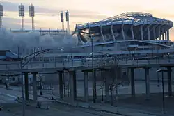 In September 1996, Riverfront Stadium was renamed "Cinergy Field" in a sponsorship deal with Greater Cincinnati energy company Cinergy. In 2001, to make room for Great American Ball Park, the seating capacity at Cinergy Field was reduced to 39,000. There was a huge in-play wall in center field visible after the renovations, to serve as the batter's eye. The stadium was demolished by implosion on December 29, 2002.