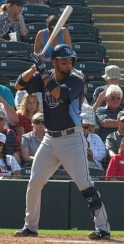 Chirinos was promoted to the majors for the first time on July 18, 2011, by the Rays.[6] He doubled in his first major-league at bat against A. J. Burnett of the New York Yankees. Chirinos hit his first MLB home run on August 3 against the Toronto Blue Jays. He also recorded his first career RBI earlier in the same game. In his rookie season, Chirinos batted .218/.283/.309.[7] That season Chirinos allowed 21 stolen bases, as he caught 2 runners, for a caught-stealing percentage of 9%.[7] Chirinos had an opportunity to make the big league club in 2012 out of spring training, but he suffered a concussion which prevented him from playing any baseball during the 2012 season. He was designated for assignment on March 31, 2013.