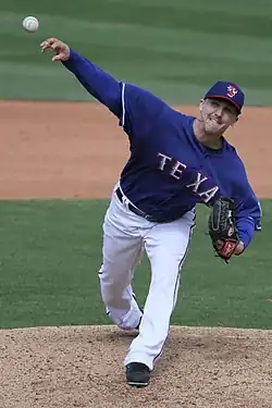 After scheduled starting pitcher Nick Tepesch had a blister form on his pitching hand, Wolf got the chance to make a start with the Rangers. On May 22, Wolf was called up to start against Oakland, where he gave up 1 run in 5 innings, earning his first career win.[7] Instead of being optioned back to Round Rock, he stayed with Texas in the bullpen. On June 8, 2013, Wolf pitched 6.2 innings of relief in an 18-inning showdown between the Texas Rangers and the Toronto Blue Jays in which he gave up 1 unearned run in the bottom of the 18th inning. He became the fourth pitcher in 50 years to throw at least 6.2 innings with 0 earned runs and get stuck with a Loss. The most recent was current Rangers broadcaster Steve Busby who, ironically, lost to the Rangers in his game.[8] Wolf made more 2 starts in July but was otherwise used in the bullpen. From August to the end of the season, he only appeared in 5 games. In 22 games with the Rangers in 2013, he went 1-3 with a 4.15 ERA and 1 hold, striking out 21 in 47.2 innings.