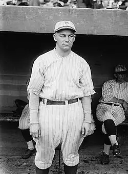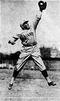 Youngs made his major league debut on September 25 and played in seven of the last nine games of the season for the eventual National League (NL) pennant-winners: six in center field and one in right. In those seven games he went 9-for-26 (.346) with two doubles and three triples.[4] In 1918, regular Giants right fielder Dave Robertson left the team to manage a local military ballclub,[7] and Youngs was given the full-time job out of spring training. Batting exclusively left-handed, Youngs responded by batting .302 in 121 games, finishing sixth in the league.[4][8] It would be the first of seven straight seasons in which he hit .300 as a regular, and the second of eight overall counting his brief stint in 1917. He also finished sixth in the NL with a .368 on-base percentage (OBP).[8] The next season Robertson was traded to the Chicago Cubs for pitcher Phil Douglas, leaving Youngs to become a fixture in right field for the Giants.[9] Youngs finished third in the NL in 1919 with a .311 batting average.[10] His .351 batting average in 1920 was second in the NL to Rogers Hornsby.[11]