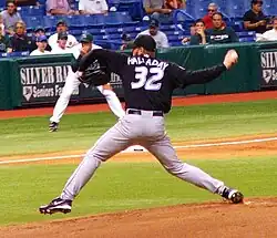 In his third start, Halladay pitched a complete game against the Texas Rangers, in a 4–1 win.[29] Three of his nine complete-game efforts resulted in losses due to Toronto's underachieving offense early in the season. In fact, those three complete-game losses came in three consecutive starts. On June 20 against the Pittsburgh Pirates, he was struck in the temple by a line drive off the bat of Nyjer Morgan. The ball caromed off Halladay's head and was caught by third baseman Scott Rolen, ending the inning. Halladay was able to walk back to the dugout, but was taken out of the game for safety concerns.[30] Although he was given a clean bill of health for his next start, it was later suggested by television commentators that Halladay may have in fact suffered a temporary lapse in recognition of what happened on the play. Halladay pitched his 10th career shutout against the Seattle Mariners on June 30. He limited them to four hits in his sixth complete game of the season.[31] The shutout tied him with the Cardinals' Mark Mulder for 10th among active pitchers. On July 11, 2008, Halladay pitched his seventh complete game and second shutout of the season against the New York Yankees, allowing no runs on two hits for his 11th career shutout.[32] Halladay was named to the American League All-Star Team as a reserve. He pitched in the fourth inning, yielding one hit, and striking out Lance Berkman. In his last start of the season, he fittingly pitched a complete game against the Yankees, earning his 20th win of the year.[33] In so doing, he became the first pitcher to win five games against the Yankees in a single season since Luis Tiant in 1974. In addition, he led the AL with a 1.05 WHIP. Halladay finished second in the American League Cy Young Award voting, behind Cliff Lee of Cleveland.[34] He also led the AL with nine complete games, and struck out a career-high 206 batters (two more than his 2003 season) as well as posting a 2.78 ERA (the second-best of his career) that was second only to Cliff Lee's 2.54 ERA. Halladay also became just the fourth pitcher in major league history to post two seasons of 200 strikeouts and fewer than 40 walks. He was presented the George Gross/Toronto Sun Sportsperson of the Year award.[35]
