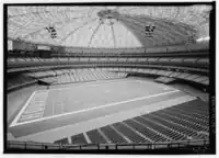 HSA also was responsible for the development of the Astrodome, initially known as the Harris County Domed Stadium, the first large covered baseball and football facility in the world; the earliest discussions of a domed stadium in Houston were held at Hofheinz's house.[1] Hofheinz later recounted the genesis for the Astrodome came from a 1962 visit to Rome with his wife Dene: "Mama and I were standing there looking at the Colosseum. It was a large, round facility and most of the stadiums in the United States had been built to conform to the shape of the playing fields. Rectangular. I studied the history of the Colosseum and I found out that on hot days they used to have the slaves pull a cover over the top made out of papyrus or whatever they used in those days. I guess they didn't want to spoil the lions' appetite with too much heat. And I found out, too, that the emperor and the bigwigs all sat at the top of the stadium. Standing there, thinking back on those days, I figured that a round facility with a cover was what we needed in the United States and that Houston would be the perfect spot for it."[9]