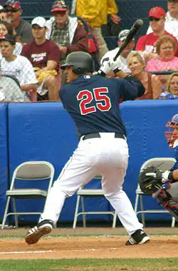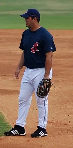 Garko was selected as a catcher by the Cleveland Indians in the third round (78th overall) of the 2003 Major League Baseball draft.[14][15] On July 8, 2003, he signed a contract with the Indians and was assigned to the Single-A Mahoning Valley Scrappers of the New York–Penn League.[16] In his first professional season, Garko batted .273 with four home runs and 16 RBI in 45 games.[17] The next season, 2004, he split time between the Class-A Advanced Kinston Indians, the Double-A Akron Aeros, and the Triple-A Buffalo Bisons. During April, he was named the "Player of the Month" in the Carolina League.[18] He was also named the 13th best prospect in the Carolina League by Baseball America.[19] He batted a combined .330 with 33 doubles, 22 home runs, and 99 RBI in 113 games with all three leagues.[17] Garko was third in the Carolina League in batting average with a .328 clip, and sixth in home runs with 16.[20] At the end of the season, he was named the Cleveland Indians' minor league player of the year by USA Today.[21] Garko participated in the Arizona Fall League (AFL) at the end of the 2004 season. With the Peoria Javelinas in the AFL, he batted .348 with 40 hits, five home runs, and 30 RBI in 30 games.[10] He was named to the AFL Raising Stars team, an all-star team voted upon by managers and coaches.[22]