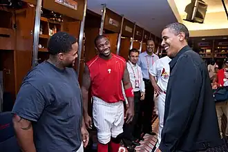 Howard has a fraternal twin brother named Corey,[90] as well as an older brother and a sister. He says he is the smallest of the Howard sons. His favorite baseball team growing up was the St. Louis Cardinals. Howard has a son named Darian Alexander, who was born on January 26, 2001.[91] Howard graduated from Lafayette High School (Wildwood, St. Louis County, Mo.) in 1998, where he played trombone. While attending Missouri State University he became a member of the Phi Beta Sigma fraternity and his line name was "Blue Hurt". Howard is a representative for a number of products including Under Armour and the Subway restaurant chain.[92] He also appeared on the cover of MLB 08: The Show.[93][94]