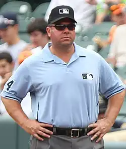 Sam Holbrook began his umpiring career in the Appalachian League in 1990, followed by stints in the Midwest, Carolina, Texas, Eastern and International Leagues before making his Major League debut in June 1996.[2] Holbrook worked the 1996 season in the American League, followed by three seasons in the National League. In 1999, he was one of 22 umpires whose resignations were accepted (in a failed union negotiating tactic), and was rehired in 2002, umpiring games in both Major Leagues since then.[3] Following the death of his wife in 2014 he was placed on bereavement leave and did not umpire at all that season. Holbrook has umpired in six Division Series (2005, 2007, 2010, 2013, 2019, 2021), four League Championship Series (2008, 2009, 2011, 2012), and three World Series (2010, 2016, 2019). He also officiated the 2004 MLB All-Star Game.[3] Holbrook was named a crew chief in February 2017 by MLB. He is joined on his 2017 crew by Greg Gibson, Jim Wolf and D.J. Reyburn. He retired following the end of the 2021 season.[4]
