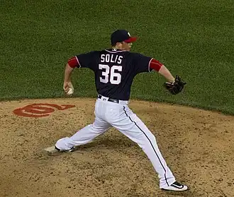 The Washington Nationals selected Solís in the second round, with the 51st overall selection of the 2010 MLB Draft,[4] and Solís received a $1 million signing bonus to sign with Washington.[8] Pitching for the Scottsdale Scorpions of the Arizona Fall League (AFL) after the 2010 regular season, Solís won the AFL championship. He again pitched in the AFL after the 2011 regular season, when he damaged the ulnar collateral ligament (UCL) in his elbow.[9] Before the 2012 season, MLB.com rated Solís as the 86th-best prospect in baseball.[10] He had Tommy John surgery to repair the UCL in March 2012 and missed the 2012 season.[9] He returned to Potomac in 2013,[11] and was assigned to the AFL after the 2013 season.[9]