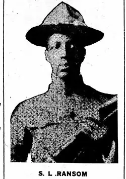 Ransom enlisted and joined the 8th Illinois Regiment of the National Guard in July 1917.[4] When he left St. Paul, the Minnesota Club where he worked threw a large party, and the patrons raised $550 and he was presented a soldier's silver wrist watch with an inscription, "From John Jackson and Sherman Finch to S.L. Ransom." The newspaper also noted that since Ransom "neither drinks, smokes, nor chews and in (reality) has no bad habits, the money will not be wasted in riotous living."[4]