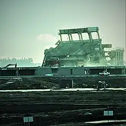On March 22, 2021, the last freestanding section of San Diego Stadium visible from Interstates 8 and 15 was felled, leaving the plaza level to be demolished.[6]