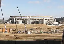 On June 30, 2020, the City of San Diego approved the sale of the stadium to San Diego State University (SDSU) and on August 10, 2020, the university officially took control.[50] A new stadium broke ground on the site one week later and ultimately opened in 2022 as Snapdragon Stadium, with a seating capacity of 35,000 to support events including SDSU football, non-football NCAA championship games, professional soccer, a possible future NFL team, and special events such as concerts.[51][52] Following failed efforts in 2010 and 2016 to build a new stadium in downtown San Diego's East Village,[53] SDSU bought the entire 135 acres (55 ha), including the existing stadium, from the city for $88 million. A competing redevelopment proposal, known as SoccerCity, envisioned that stadium site could be leased from the city and redeveloped with private funding if San Diego was awarded a Major League Soccer team. The SoccerCity proposal was placed on the November 2018 ballot alongside the SDSU proposal but was defeated.[54] The entire $3.5 billion SDSU project includes housing, office, and retail space, hotels, and 80 acres of parks and open space including a 34-acre river park on city property and will be rolled out in phases over 8–10 years.[55]