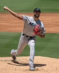 On December 14, 2017, the Cardinals traded Alcántara, along with Magneuris Sierra, Zac Gallen, and Daniel Castano to the Miami Marlins for Marcell Ozuna.[10] MLB.com ranked Alcántara as Miami's third-best prospect going into the 2018 season.[11] He began 2018 with the New Orleans Baby Cakes, and was recalled by Miami on June 28.[12] He made his Marlins debut on June 29 as the starting pitcher, pitching five innings in which he gave up one run on three hits and five walks while striking out two, earning the win as Miami defeated the New York Mets 8–2.[13] He was placed on the 10-day disabled list on with a right axillary infection.[14] On May 19, 2019, Alcántara pitched his first career shutout, an 89-pitch two-hit Maddux against the New York Mets.[15]