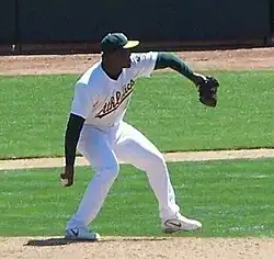On January 20, 2017, Casilla signed a two-year, $11 million contract with the Oakland Athletics.[59] Visa problems caused him to be three weeks late to spring training, and he decided not to pitch for the Dominican Republic in the 2017 World Baseball Classic, even though he had initially been selected to the team.[60] He was expected to compete for the closer's role, though Jane Lee of MLB.com wrote in January that the likely favorite was Ryan Madson, who had closed for the Athletics the season before.[59] Oakland began the season without a closer named, though, and on April 11, manager Bob Melvin said in an interview that "It's gonna be [Sean] Doolittle or Casilla depending on the match-ups".[61] Doolittle was out during the month of May with a strained left shoulder, however, giving Casilla the bulk of the early-season opportunities.[62][63][64] He converted saves in 14 of 17 chances through the end of June but struggled in July, blowing three of five save opportunities. In August, he was replaced as closer by the newly acquired Blake Treinen.[63][65][66] He was 16 for 23 in save opportunities. In 63 games, he had a 4–5 record and an ERA of 4.27 with 57 strikeouts in 59 innings pitched.[3]