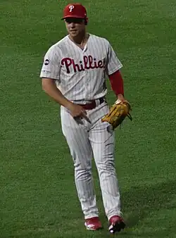 Kingery, disappointed with his hitting production as a rookie, spent the 2018–19 offseason training with his longtime exercise partner Judge and private hitting coach Richard Schenck to improve his plate discipline.[38] This training was reflected during the season, when Kingery swung at 9.1 percent more pitches in the strike zone and 5.8 percent fewer pitches outside of it.[39] Although he played in 21 fewer games during the 2019 season, Kingery had better offensive numbers, batting .258 with 19 home runs.[40] His position within the team, both offensively and defensively, continued to fluctuate. When outfielder Andrew McCutchen suffered a season-ending knee injury, the Phillies used Kingery as one of several leadoff batting options.[41] McCutchen's injury, combined with Odúbel Herrera's suspension for a domestic violence incident, pushed Kingery to center field for the majority of the season.[42]