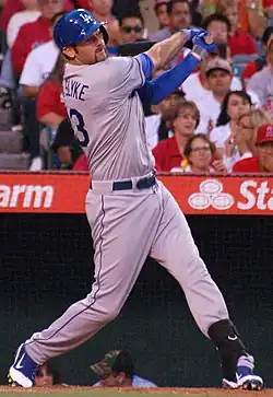 In 2015, he hit .239/.317/.383 in 96 games with six homers and 30 RBI.[1] He battled left mid-back and right wrist issues for much of the season, which negatively affected his performance.[17][18] Following the season, he agreed to a one-year, $1.225 million contract with the Dodgers for 2016, avoiding salary arbitration.[19]