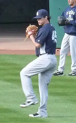 On November 3, Mitre signed a one-year minor league contract with the New York Yankees with an option for 2010.[32] Mitre was suspended for the first 50 games of the 2009 season after testing positive for androstenedione in August 2008. Mitre said the androstenedione came from a contaminated legal supplement purchased from GNC, but took full responsibility for his actions. He served his suspension while still on the disabled list from last year's Tommy John surgery.[33] Mitre pitched to a 2.40 ERA in seven starts for the Scranton/Wilkes-Barre Yankees in Triple-A before he was called up to start against the Baltimore Orioles on July 21.[34] In total, he had a 6.79 ERA across 12 appearances (nine starts) that season.[35] The Yankees declined their option on him after the season.[36]