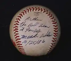 Swirsky's baseball collection included the ball that went between Bill Buckner's legs in the 1986 World Series (it was originally owned by Charlie Sheen; Swirsky got it in April 2000);[54] the only known bottle of 1986 sparkling wine from the Red Sox celebration that would never be;[55] Reggie Jackson's third home run ball from the 1977 World Series; a ball signed by The Beatles the night they played their famous Shea Stadium concert in 1965; Tom Seaver's 1969 World Series jersey; the only known surviving ball from the second game of Johnny Vander Meer's two consecutive no-hitters, and the letter written by baseball commissioner Kenesaw Mountain Landis banning Shoeless Joe Jackson from playing Major League Baseball,[56] among other historic items. The Buckner ball went up for auction on October 15, 2011, for $1 million.[57] It failed to sell.[58][59]