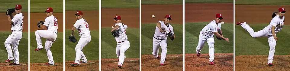 On January 11, 2016, Oh signed a one-year contract with the St. Louis Cardinals of Major League Baseball (MLB),[14] with a club option for a second season. The Cardinals had scouted him for seven years while he pitched in Asia. During contract negotiations with St. Louis, Oh indicated that his goal was to become the first player to appear in the Korean Series, the Japan Series, and the World Series.[15] He was initially assigned to help set up for incumbent closer Trevor Rosenthal.[13] Oh made his Major League debut on Opening Day 2016 against the Pittsburgh Pirates. He pitched one inning, walking two batters and striking out two batters, while throwing 27 pitches. He earned his first major league win against the Atlanta Braves on April 10, pitching a scoreless inning in a 12–6 outcome.[16]