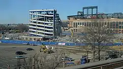 After salvaging operations concluded, demolition of the ballpark began on October 14, 2008. On October 18, the scoreboard in right field was demolished, with the bleachers, batter's eye and bullpens shortly thereafter.[23]