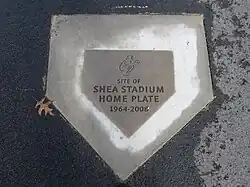 The locations of Shea's home plate, pitcher's mound, and bases are marked in Citi Field's parking lot. The plaques feature engravings of the neon baseball players that graced the exterior of the stadium from 1988 onward.[28]
