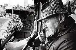 Feller served as the Fenway Park public address announcer for 26 years from 1967 until just before his death in early 1994.[2] Feller was known throughout baseball for his distinct voice, which was described as slow with a gravely, measured cadence.[7] Feller attributed his unique sound to the fact that he spoke without his dentures while calling a game. He was also known for keeping his announcements simple, typically saying the batter's uniform number, full name, position and last name when the batter would step up to the plate, such as "Number 26, Wade Boggs. Third base, Boggs." Feller was also known to generations of Red Sox fans for beginning each Red Sox home game with, "Ladies and gentlemen, boys and girls, welcome to Fenway Park."[10] Even long after Feller's death, games broadcast on NESN begin with a sound clip of Feller making this announcement.